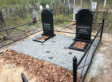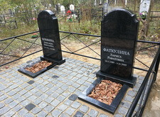 После создания основания мы покрыли территорию места захоронения гранитной брусчаткой, параллельно с этим установив заранее изготовленные памятники и цветники. Затем вернули на место металлическое ограждение и засыпали цветники и площадь перед брусчаткой корой. Этап работ на снимках не отображён, однако на приведённых ниже фото отлично виден итоговый результат.