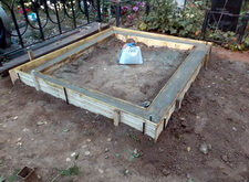 Завершив подготовительные работы, мы перешли непосредственно к могиле. Предварительно демонтировав уже установленную оградку и обе таблички, мы вырыли траншею по периметру участка. В каждый угол получившегося квадрата мы вкрутили сваи, которые послужили опорами каркаса из арматуры. Такая конструкция придаст бетонному цоколю необходимую жёсткость, обеспечит прочность, а также исключит вероятность провалов и перекосов.