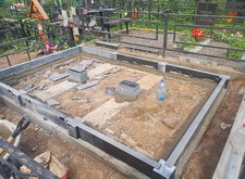 Подготавливаем территорию вокруг места захоронения к покрытию брусчаткой: ввариваем металлическую полосу и укрываем землю геотекстилем.