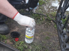 Грунтуем оградку с помощью пневматического пульверизатора.