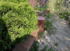 Вернули на место гранитный цоколь, дополнив его установленной на оградке лавочкой, заполнили цветник корой. По периметру места захоронения тоже положили наземное покрытие. Под всей брусчаткой на участке находятся полотна геотекстиля, благодаря которым решается проблема с прорастающей травой.