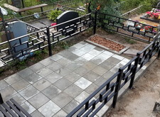 Затем переходим к последовательной укладке наземного покрытия. Предварительно застелив всю площадь участка геотекстилем, мы рассыпали пескобетонную смесь, на которую и выкладываем плитку. Работа с покрытием проходит поэтапно: мы начинаем от дальнего к надгробью края могилы, установив там дополнительные лавочку и столик.