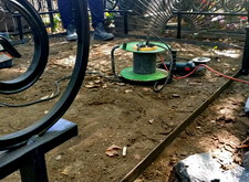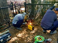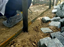 Монтируем оградку, вваривая согласованные с клиентом уголки. По низу пускаем металлическую ленту, которая обозначит границу выложенной брусчаткой территории.