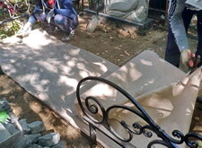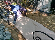 На представленных ниже фотографиях состояние места захоронения на момент прихода клиента. Брусчатка положена, форма цветника и вид оградки изменены. Работа над этим объектом – яркий пример того, как сильно может повлиять на внешний вид участка лишь одно наземное покрытие.