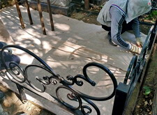 В данном заказе клиент просил нас сделать следующие: замостить площадь места захоронения гранитной брусчаткой, переделать длинный цветник и каким-то образом видоизменить не нравившуюся ему оградку.