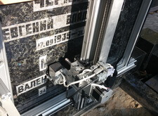 Далее вы можете видеть процесс гравировки надписи на стоячем памятнике. Редкие смельчаки отваживаются на подобную работу. Любая ошибка грозит тем, что нужно будет полировать весь камень, а сделать это руками на месте не всегда возможно, а если и возможно, то ручная полировка всегда хуже полировки на станке. А ни один клиент не хотел бы платить деньги за работу, после которой плита будет хуже, чем до проведения работ. Как вы можете видеть, мы умеем делать такую сложную работу.
