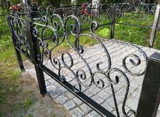 Так выглядело место захоронения на момент окончания работ: оградка заменена, памятник дополнен цветником и вазой, земля укрыта брусчаткой. Помимо этого, мы покрыли секции ограждения серебрянкой.